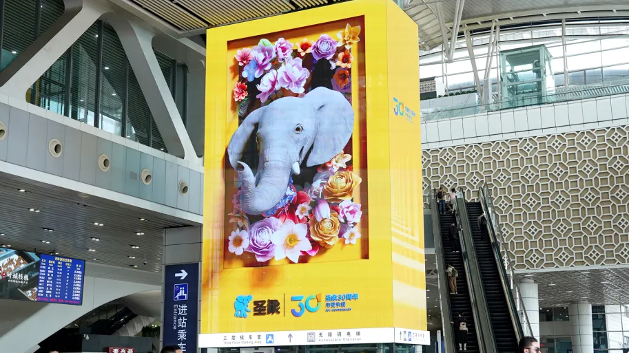 《繁花映象》以品牌IP——“象”為線索,從小象萌生到群象共生,側面刻畫圣象30年來不同階段的發展變化,以頗具創意的數字化內容表達,在高鐵車站與商圈大屏聯袂演繹自然與科技的共生詩篇。