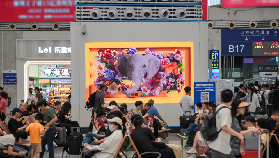 不同于商圈的“巨幕奇觀”,高鐵場景下則更加注重“即時互動效果”與沉浸式觀感體驗。通過兆訊高清刷屏媒體,憨態可掬的小象擷花贈予往來旅客,“人與自然”間溫馨和諧的一幕自然融入高鐵場景,引領旅客邂逅時空奇遇,打造出與巨幕LED截然不同的近距離互動體驗和人屏互動性。